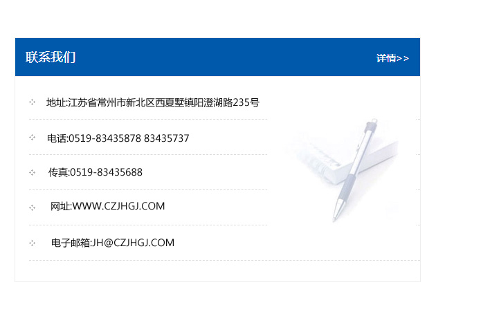 傳真:0519-83435688    郵編:213135    網址:WWW.czjhgj_com.huangxg.com    電子郵箱:JH@czjhgj_com.huangxg.com